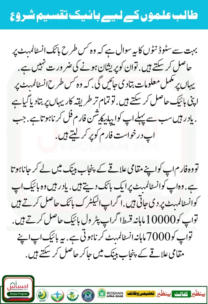 حال ہی میں اس پروگرام کا اغاز کیا گیا تھا . تو بہت سے طالب علموں تو بائک دی گئی تھی . لیکن وہ طالب علم جن کو بائک نہیں ملی . اب وہ اپنی رجسٹریشن کروا سکتے ہیں . اور گھر بیٹھے اپنی بائیک حاصل کر سکتے ہیں . فیز ٹو شروع ہو گیا ہے وہ طالب علم جن کو بائک نہیں ملی . وہ اپنی بائک نیو میتھڈ کے ذریعے چیک کر کے حاصل کر سکتے ہیں کہ ایا کہ اپ اہل ہیں یا نہیں .