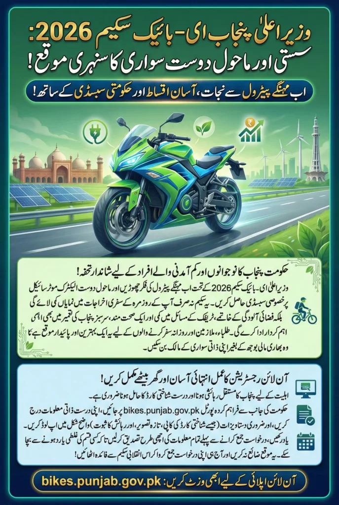CM Punjab e-Bike Scheme 2026 is an initiative designed to support youth and lower-income riders in Punjab by making electric bicycles more affordable and accessible. Under this program, the Punjab government aims to reduce transportation costs, promote eco-friendly commuting, and provide a sustainable travel option for students, workers, and daily commuters.