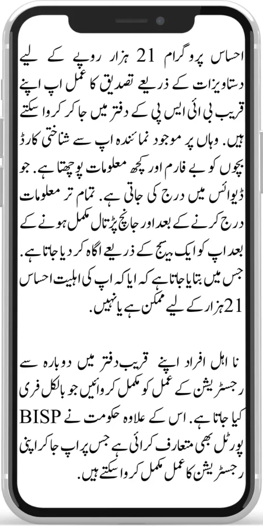 Ehsaas program can be verified through documents for Ehsaas Program 21000 by going to your nearest BISP office. The representative there asks you for an ID card, child form, and some information. which is recorded in the device. After entering all the information and the verification is complete, you are notified through a message.