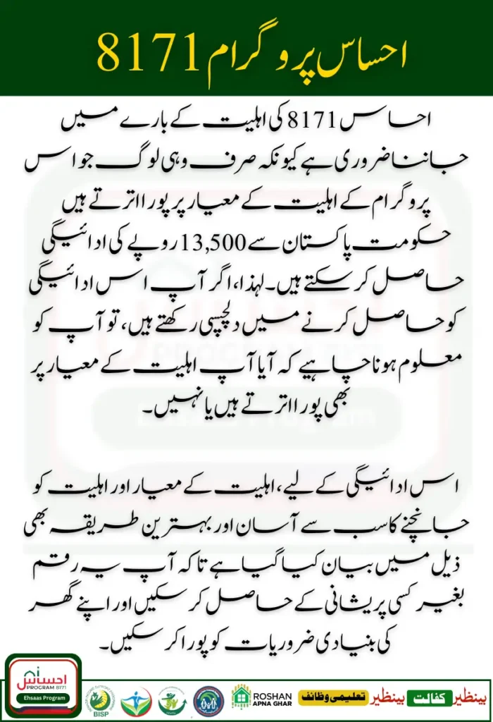The eligibility criteria for getting the payment of Rs. 13,500 under the BISP 8171 program are as follows: