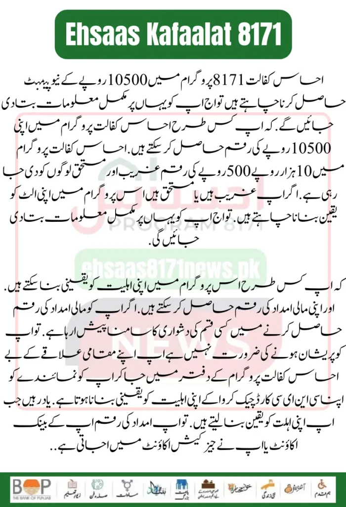 If you want to get a new payment of 10500 rupees in the Ehsaas Kafaalat 8171 program, you will be given complete information here on how you can get your 10500 rupees in the Ehsaas Kafaalat program. In the Ehsaas Kafaalat program, an amount of 10500 is being given to the poor and deserving people. If you are poor or deserving, want to make sure of your future in this program. So here, you will be given complete information about how you can ensure your eligibility in this program.