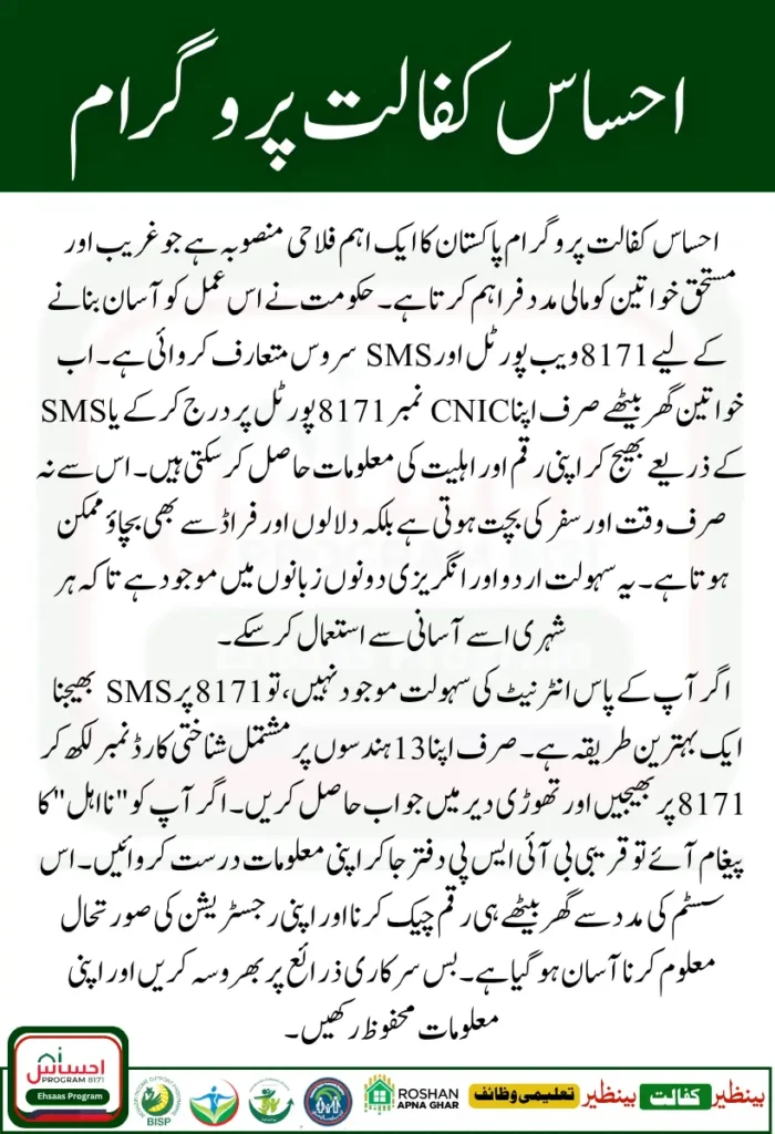 The Ehsaas Kafalat Program is a vital support system for Pakistanβs most deserving families. With the introduction of the 8171 portal and SMS services, beneficiaries can now verify their payments and eligibility status from the comfort of their homes.