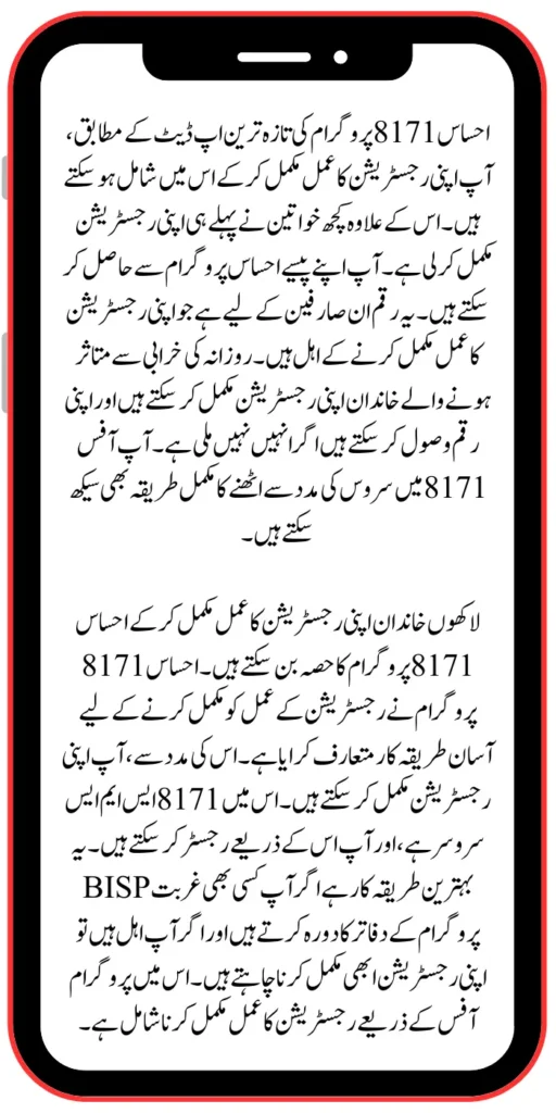Millions of families can become part of the Ehsaas 8171 program by completing their registration process. The Ehsaas 8171 program has introduced easy procedures for completing the registration process. With this help, you can complete your registration. It has an 8171 SMS servicer, and you can register through it. This is the best procedure if you visit any poverty BISP program offices and want to complete your registration now if you are eligible. It involves completing the registration process through the program office.