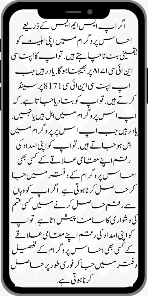 If you want to ensure your eligibility in the Ehsaas program through SMS. So you have to send yours to CNIC 8171. Remember to send your CNIC to 8171. So you are told. Whether you are eligible for this program or not. Remember when you qualify for the program on this. So you have to go to any Ehsaas program office in your local area to get your aid amount. If you face any problem getting money from there, you must go to the tehsil office of any Ehsaas program in your local area and get your aid immediately.