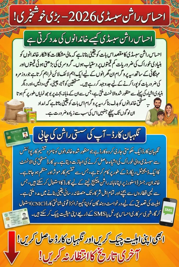 The reopening of the Ehsaas Rashan Subsidy 2026 marks an important step in providing relief to Pakistan’s most vulnerable families. By checking eligibility through CNIC and applying for the Negahban Card, eligible citizens can secure essential food items at subsidized rates.