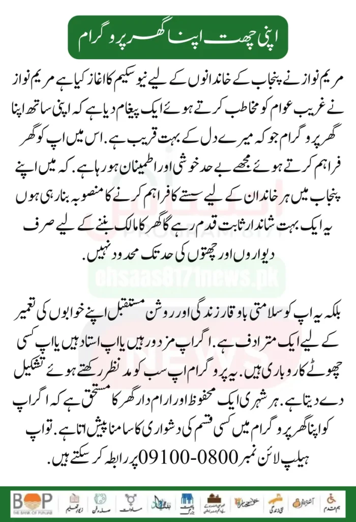 Maryam Nawaz has started a new scheme, Apni Chhat Apna Ghar, for the families of Punjab. Maryam Nawaz has given a message addressing people experiencing poverty, saying that his home program with him is very close to my heart. I am having a lot of pleasure and satisfaction while providing you with a home. It will be an extraordinary steadfastness that I am planning to provide cheap for every family in Punjab.
