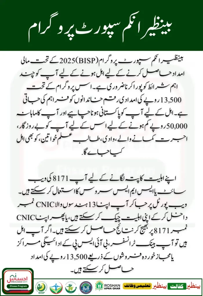 The Benazir Income Support Program (BISP) 2025 offers BISP 13500 Payments to eligible low-income families. To determine if you qualify, you can check your eligibility through the BISP 8171 web portal or via SMS. This initiative provides crucial support to individuals facing financial difficulties.