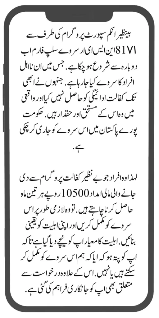 Those ineligible for the Benazir Kafalat program can complete their registration process through the 8171 NSER Survey Slip. The survey has been started by the government in different districts. Those ineligible persons who have not yet received the Benazir Kafalat payment are necessarily mentioned under this head. Apart from this, the eligibility criteria are also given below.