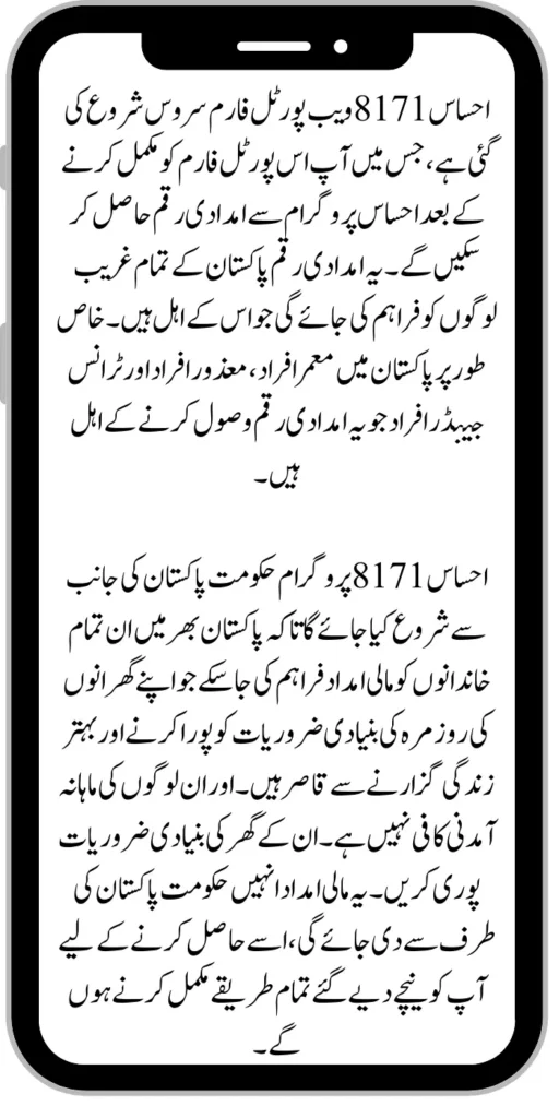 Ehsaas 8171 web portal form online registration process has been started. This process has been started for the convenience of people so that people can get their aid money after completing this process sitting at home. This aid money is given by the Government of Pakistan. has been given from the past several years. The purpose of giving this aid money is to provide financial assistance to all the poor people who cannot meet the basic needs of their homes. If you also want to get this aid money. So the complete method to achieve this has been explained in detail above.