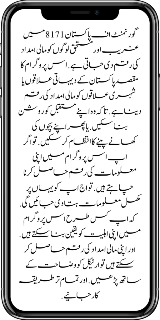 The government of Pakistan 8171 provides financial assistance to poor and deserving people. The purpose of this program is to provide financial aid to rural or urban areas of Pakistan. So that they can make their future bright or manage their children’s food and drink,