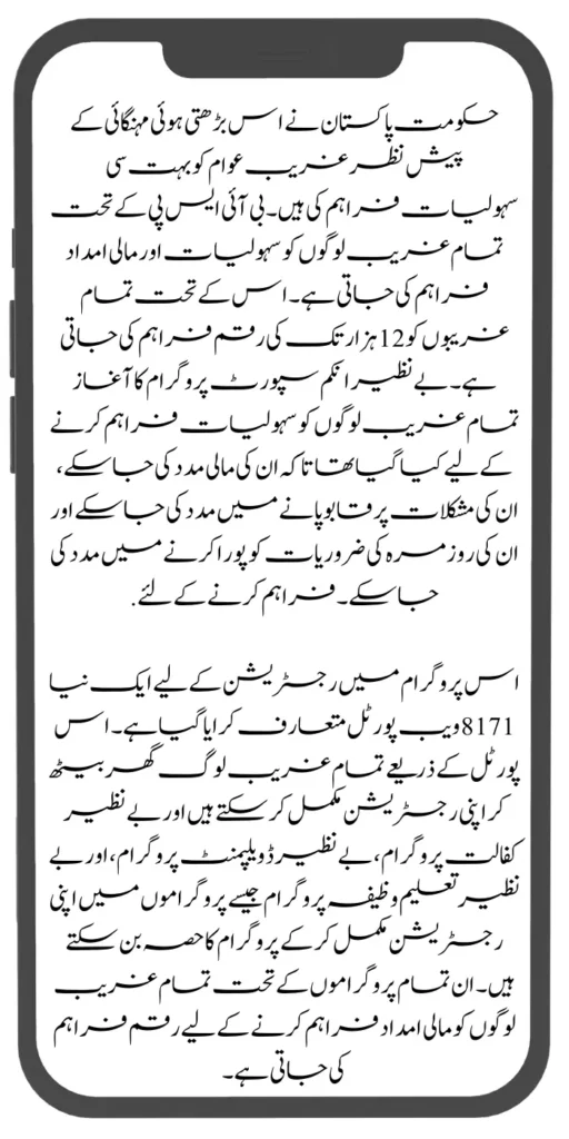 A new 8171 web portal has been introduced for registration in this program. Through this portal, all poor people can sit at home and complete their registration and become a part of the program by completing their registration in programs like the Benazir Kafaalat Program, Benazir Development Program, and Benazir Education Wazifa Program. Under all these programs, money is provided to provide financial assistance to all the poor people.