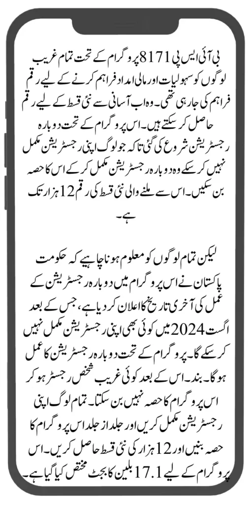 But all people must know that the government of Pakistan has announced the last date for the re-registration process in this program, after which no one will be able to complete their registration in August 2024. The re-registration process under the program will be closed. After that, no poor person can register and become a part of this program. All people should complete their registration and become a part of this program as soon as possible and get the new installment of 12 thousand. A budget of 17.1 billion has been allocated for this program.