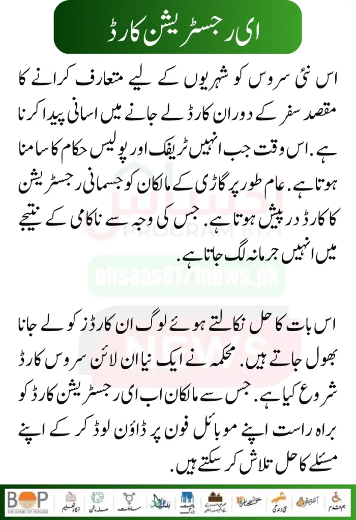 The government of Punjab has introduced an easy card for vehicle owners, which is called an e-registration card. This card can be used as a physical card. If you don’t have a card on your way. So you can directly find a solution to your problem through this card through online mobile.