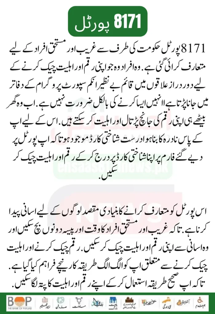 Govt has introduced an 8171 portal for poor and deserving people. Those people who have to go to Benazir Income Support Program offices in remote areas to check their money and eligibility do not need to do so at all. Now they can check and qualify their money at home.