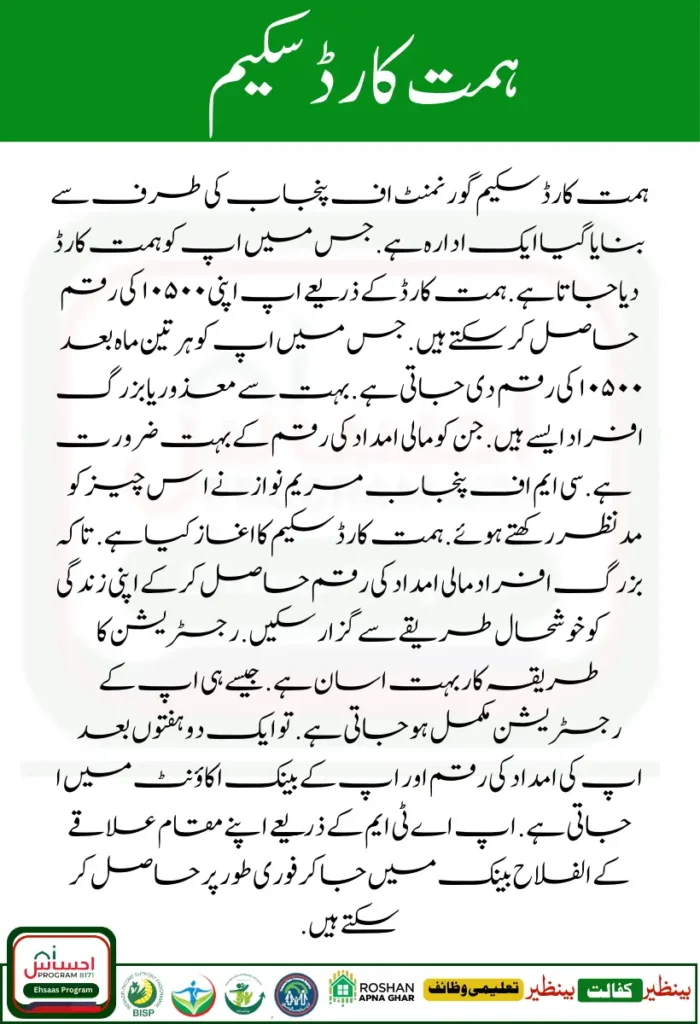 The Himmat card scheme has been started. So that the elderly can live their lives happily by getting financial assistance. The registration procedure is very easy. As soon as your registration is complete. So after a couple of weeks, the amount of your aid goes to your bank account. You can get it instantly by going to Al Falah Bank in your area through ATM.