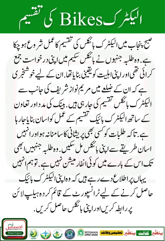 The process of electric bike distribution is being facilitated with the help and cooperation of the bank. So that the students do not face any problems and they can get their bikes easily. Those students who do not have any information about it yet. So we are informing them here to contact the established helpline of transport to get their electric bike and get their bikes.