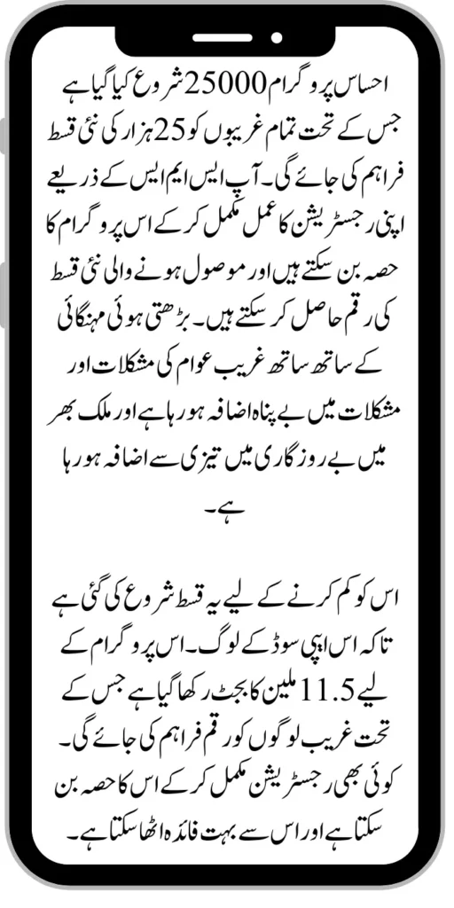 Ehsaas program 25000 has been started under which all the poor people will be provided with a new instalment of 25 thousand. You can complete your registration process through SMS become a part of this program and get the new instalment amount received. Along with rising inflation, the problems and hardships of the poor people are increasing greatly and unemployment is increasing rapidly across the country.
