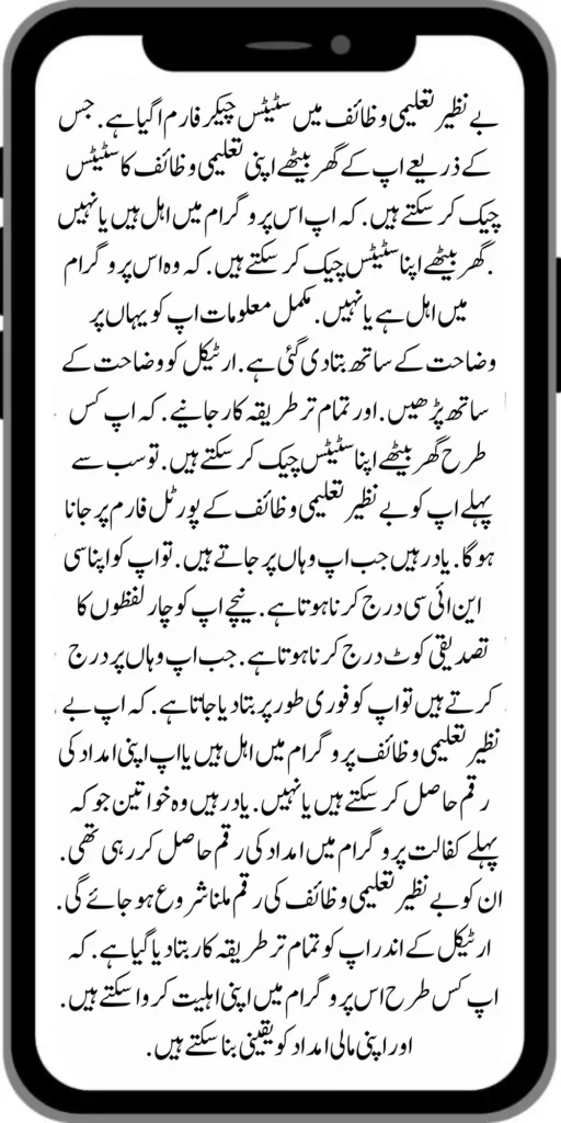 Read the article carefully and know all the procedures. How can you check your status while sitting at home? First, go to the Benazir Taleemi Wazaif Portal. Remember to enter your CNIC when you go there. Below, enter a four-word verification code. When you register there, you are notified immediately.