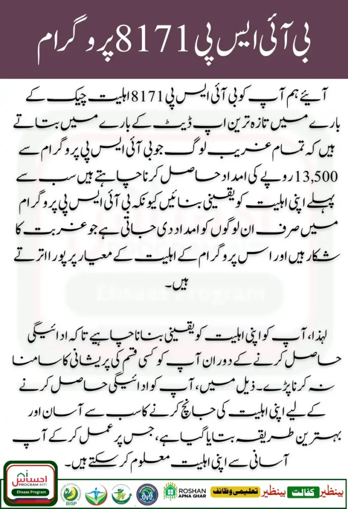 Let us inform you about the latest update regarding BISP 8171 Eligibility Check that all the poor people who want to get assistance of Rs. 13,500 from the BISP program must first ensure their eligibility because, in the BISP program, assistance is given only to those people who are suffering from poverty and meet the eligibility criteria of this program.