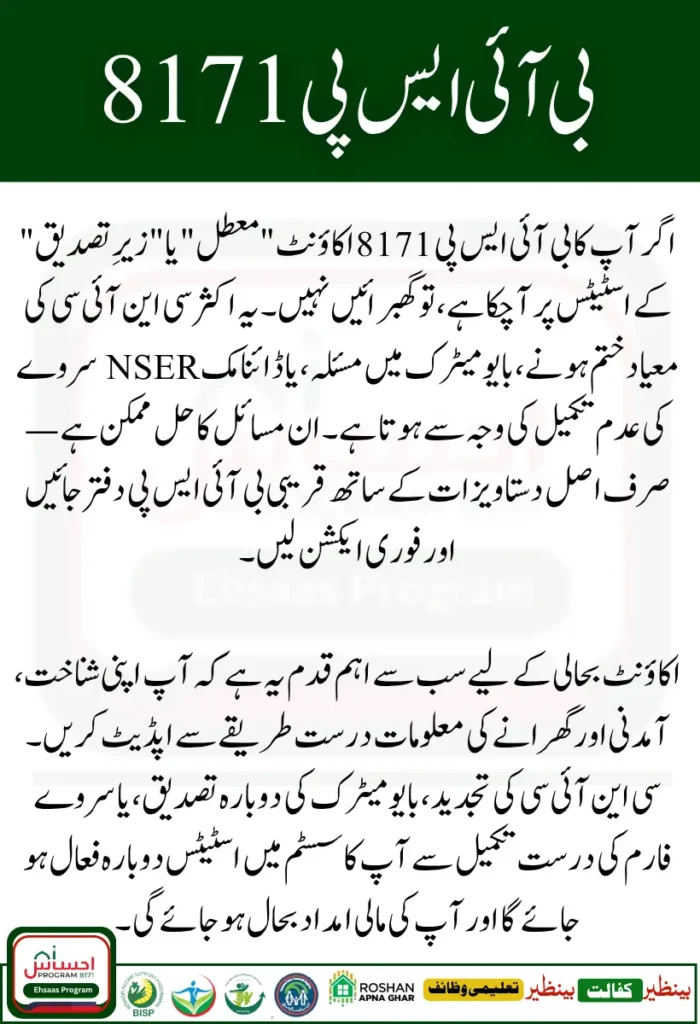 Suspension of your BISP 8171 account may seem stressful, but it’s not permanent. Most cases are simple to fix, you just need to visit the right office, provide the correct documents, and follow up. Whether your status is suspended due to CNIC expiry, biometric errors, or missed surveys, the solution is quick and straightforward.