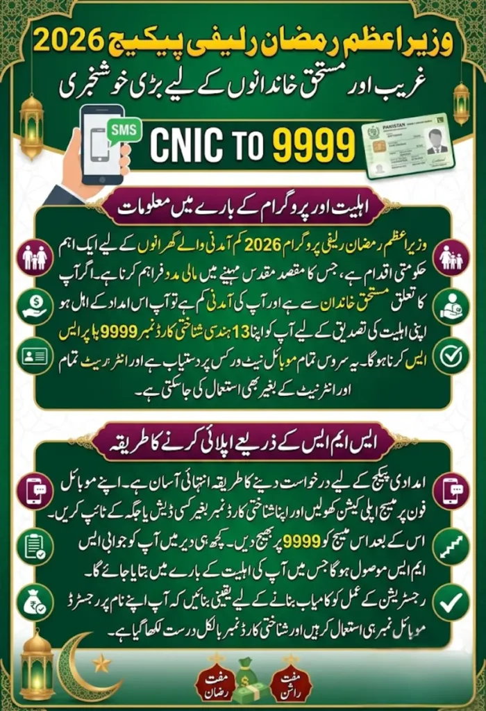 PM Ramzan Relief 2026 program is a government initiative to provide financial assistance to eligible families during the holy month of Ramadan. With rising living costs, this package aims to help low-income households meet their essential needs. One of the simplest ways to check eligibility is by sending your CNIC number via SMS to the official 9999 service.