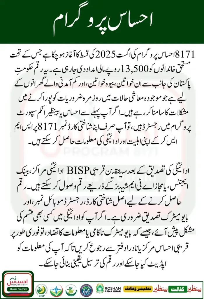 The Government of Pakistan has officially started the August 2025 installment of the 8171 Ehsaas Program, which gives Rs 13500 to qualified low-income households. This payment is meant to help women, widows, and families in need all around the country. Inflation is high and the cost of living is going up.