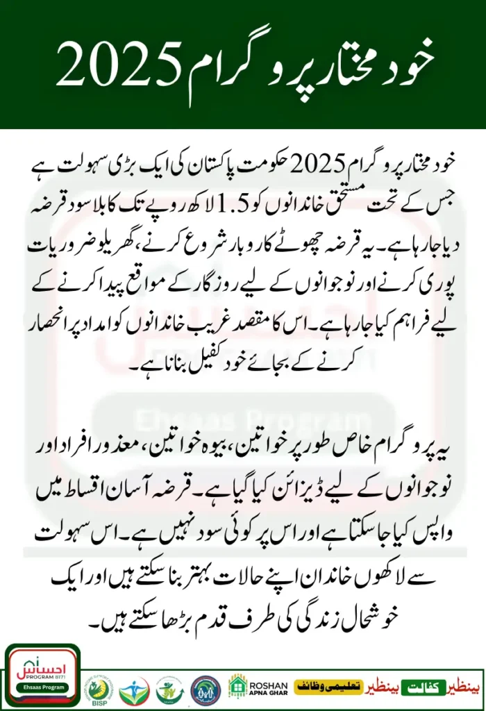 Khud Mukhtar Program 2025 In todayβs Pakistan, where inflation is at its peak and jobs are limited, many families face difficulties in managing their expenses. Small business owners and daily wage earners especially struggle to arrange money for investment or even basic needs. To solve this problem, the government has introduced the Khud Mukhtar Program 2025 Get Loan up to 1.5 Lakh.