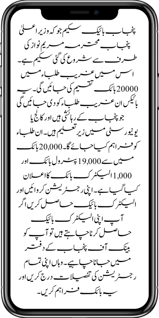 The Punjab Bike Scheme was started by the Chief Minister of Punjab Maryam Nawaz. In this way, 20,000 bikes will be distributed among poor students. These bikes will be given to poor students who are residents of Punjab and are studying in college or university. These students will be provided.