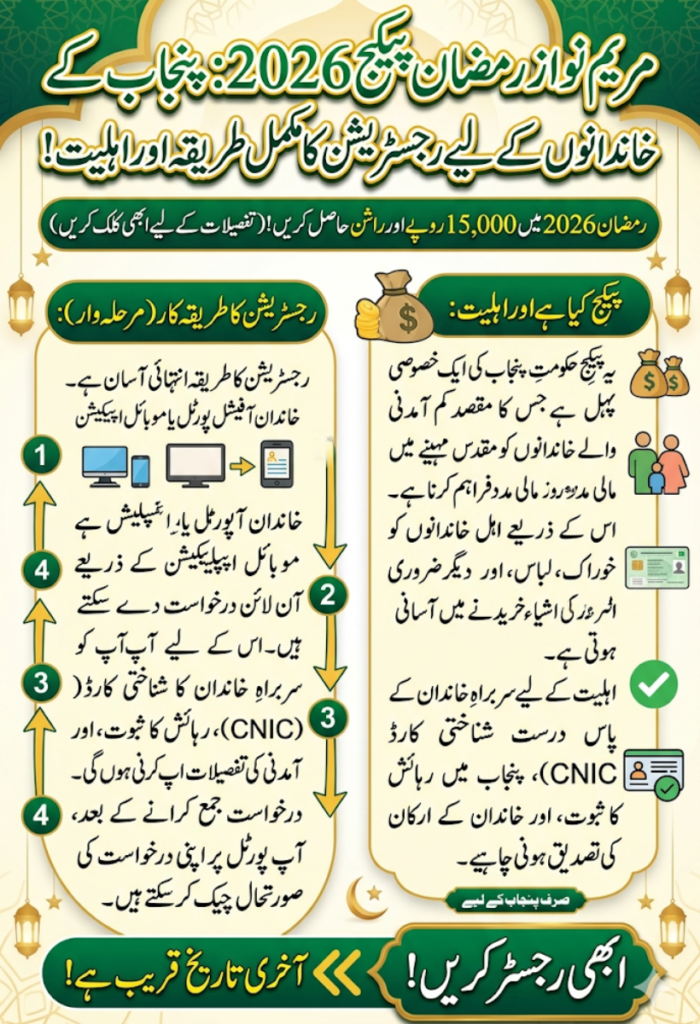 Maryam Nawaz Ramzan Package 2026 is a valuable initiative that provides essential support to Punjab families in need. By understanding eligibility requirements, preparing the necessary documents, and completing the registration carefully, families can receive timely financial assistance. This program helps ensure that every household can celebrate Ramzan with comfort and peace, reflecting the spirit of generosity and care during this holy month.