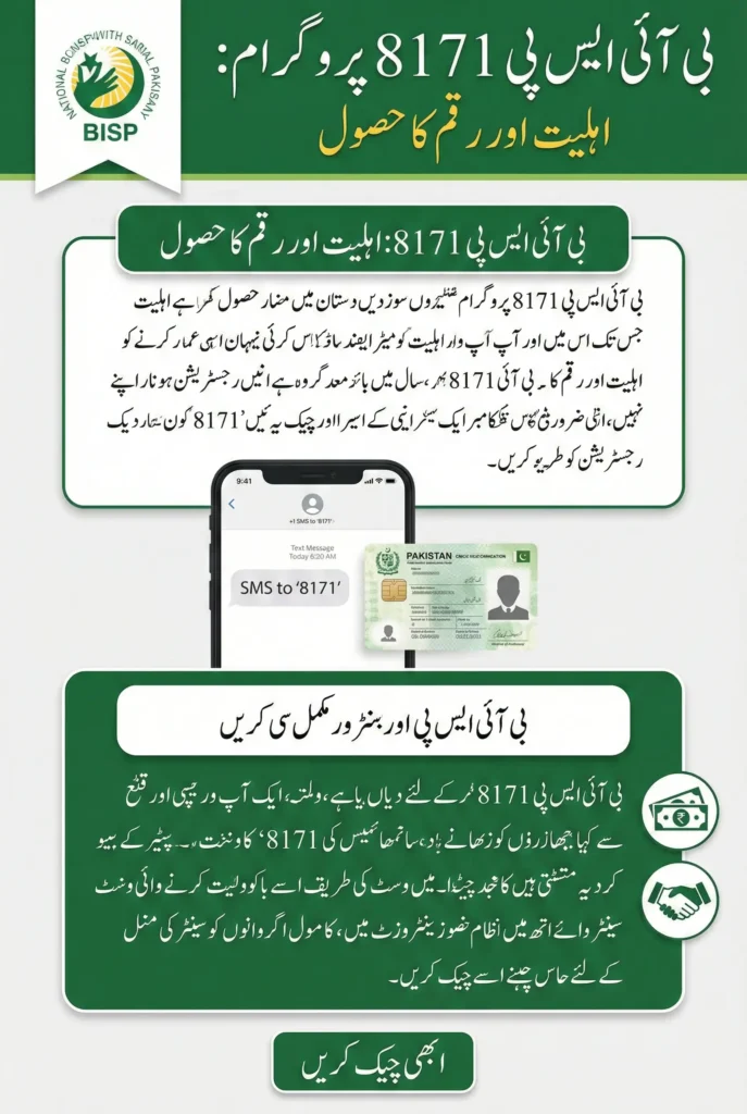 How can you ensure your eligibility in this program? So first of all you have to do your CNIC 8171 percentage. When you send your CNIC to 8171. So you are qualified in this program. When you qualify for this program. When you qualify for this program. So you have to go to any BISP program office in your area to get your aid amount.
