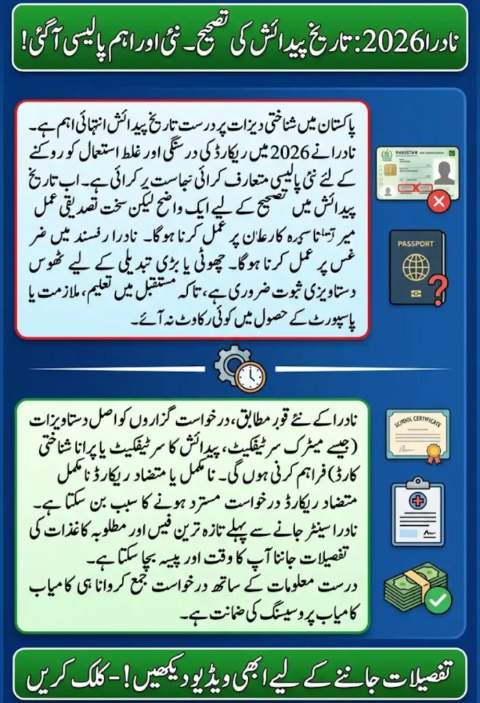 Correct personal information on your identity documents is extremely important in Pakistan. A small mistake in your Date of Birth can create serious problems in education, employment, passport applications, banking, and government schemes. NADRA 2026 Date of Birth Correction Rules correction to improve record accuracy and prevent misuse. Citizens who want to correct their birth date on CNIC or B-Form must now follow a clearer but stricter verification process.