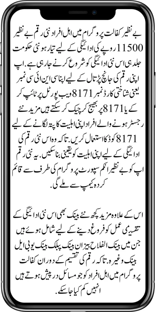 Eligible persons in the Benazir Kafalat program are ready to pay the new amount Benazir 11500 rupees, the new government is going to start this new payment soon. You can check your amount by typing your CNIC number i.e. National Identity Card Number 8171 on the web portal or by sending it to 8171. More new registrants can check their eligibility by entering the 8171 code. use. So that they can ensure their ability to pay this new amount.