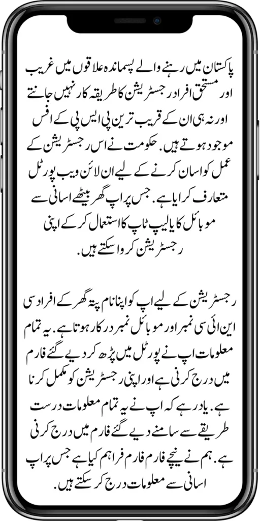 People living in remote areas of Pakistan can register online. This registration is free. You only need a strong internet facility. The registration procedure is done through a form. If you don’t have any problem, this form is available in Urdu. You can read and enter all your information easily. The sponsorship program can ensure their registration eligibility for 13500 rupees.