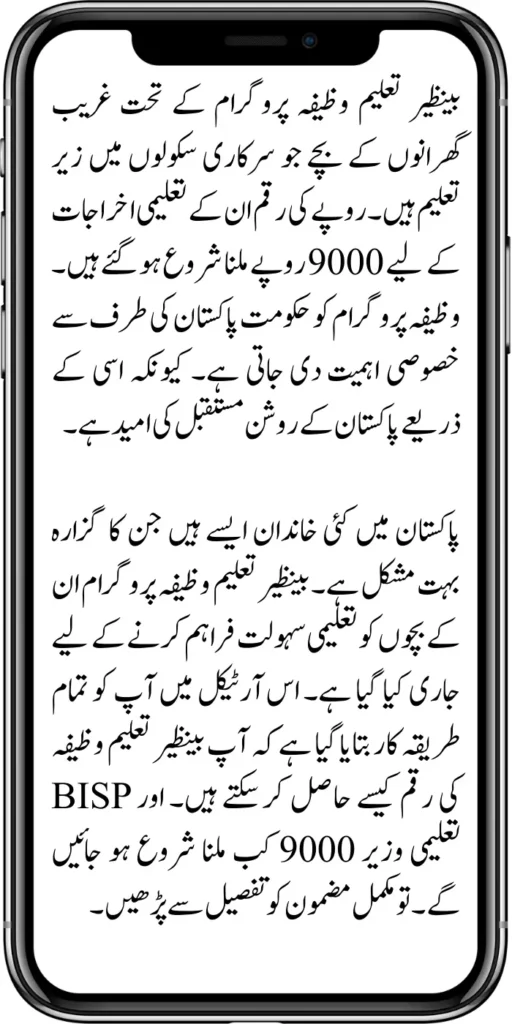 Under Benazir Taleemi Wazifa Program, children from poor families who are studying in government schools can get new payment of 4500+4500. An amount of Rs. 9000 has started to be received for their educational expenses. The Taleemi Wazifa program is given special importance by the government of Pakistan. Because through this there is hope for the bright future of Pakistan.
