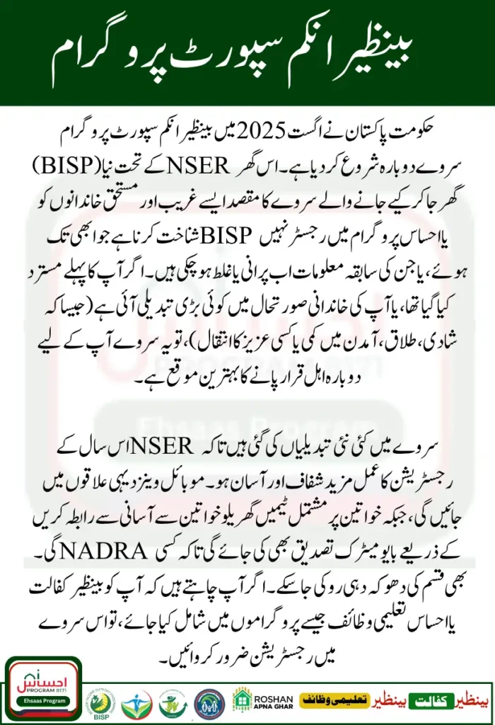 The Benazir Income Support Programme (BISP) has started the NSER (National Socio-Economic Registry) survey for August 2025 once more. This gives thousands of Pakistani families a new chance to join the federal social welfare system. If you were previously told you weren’t eligible or your household information has changed because of marriage, job loss, or disability, this campaign is your chance to have your eligibility checked again.