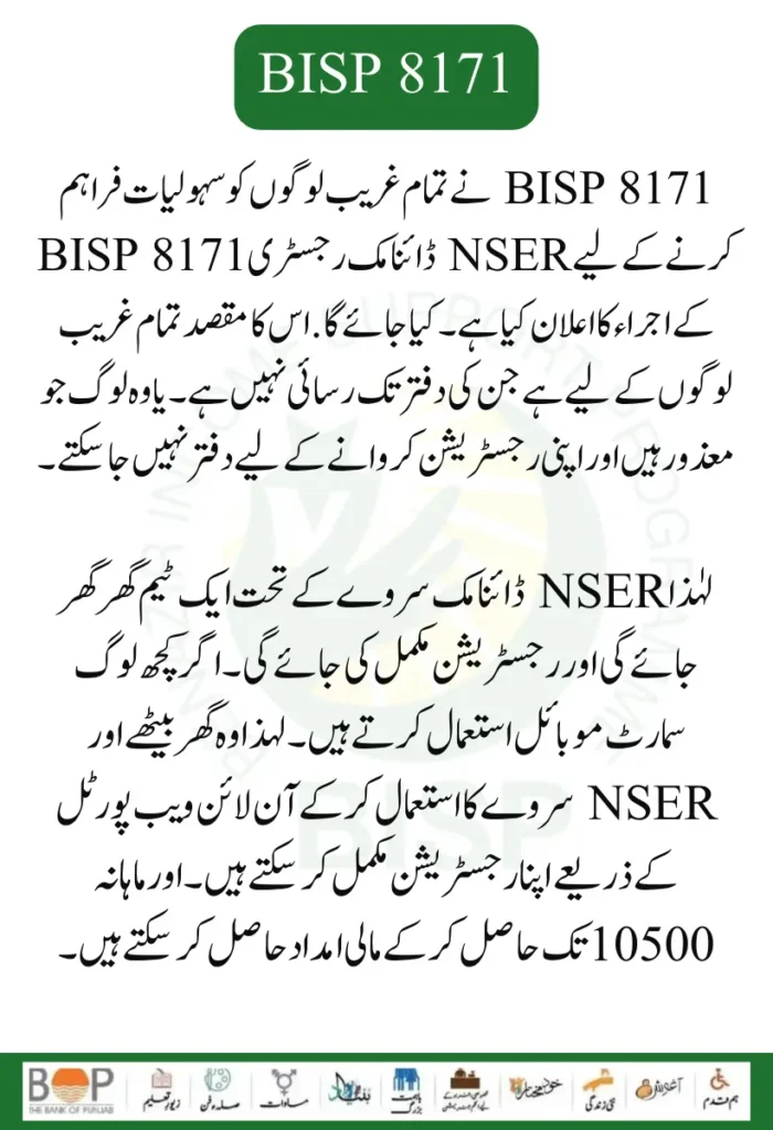 NSER Dynamic Registry BISP 8171 has been started for ineligible women. Online registration under the NSER Dynamics Survey has also been started; now, all people can complete their registration through the web portal and can be a part of the programs run under the Benazir Income Support Program, and monthly 10, 500 can get money easily.