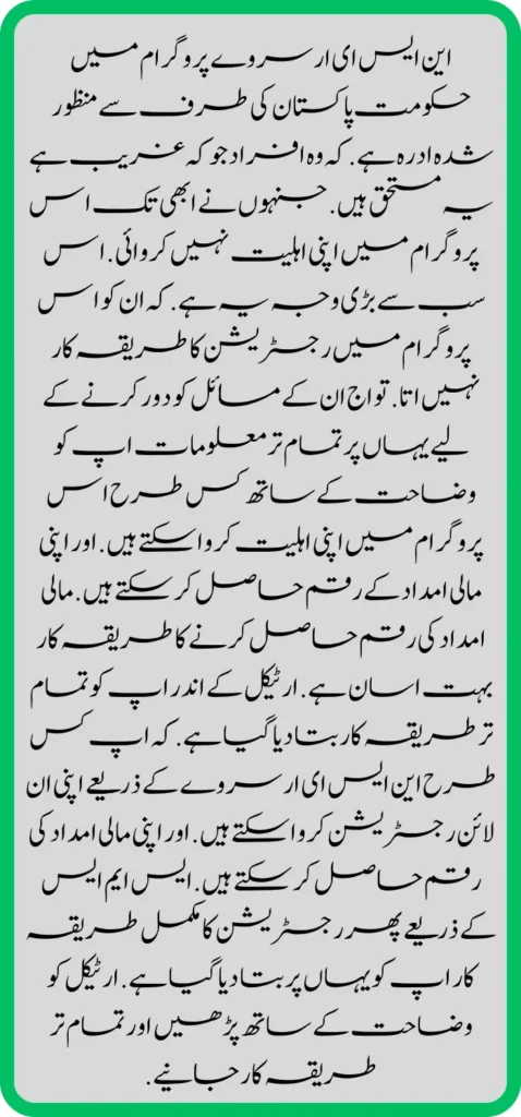 اگر اپ این ایس ای ار سروے کے ذریعے اپنی ان لائن رجسٹریشن کروانا چاہتے ہیں . تو اج اپ کو یہاں پر تمام تر طریقہ کار بتا دیا جائے گا . کہ اپ کس طرح اس پروگرام میں اپنی اہلیت کروا سکتے ہیں . اور اپنی مالی امداد کی رقم حاصل کر سکتے ہیں . این ایس ای ار سروے کی مالی امداد کے رقم ملنا شروع ہو گئی ہے . بہت سے افراد ایسے ہیں . جو کہ پہلے سے اس پروگرام میں اہل ہیں . ان کو امداد کی رقم مل رہی ہے . ان کو امداد کی رقم نہیں مل رہی . لہذا وہ اس پروگرام میں اپنی دوبارہ رجسٹریشن کروائیں .