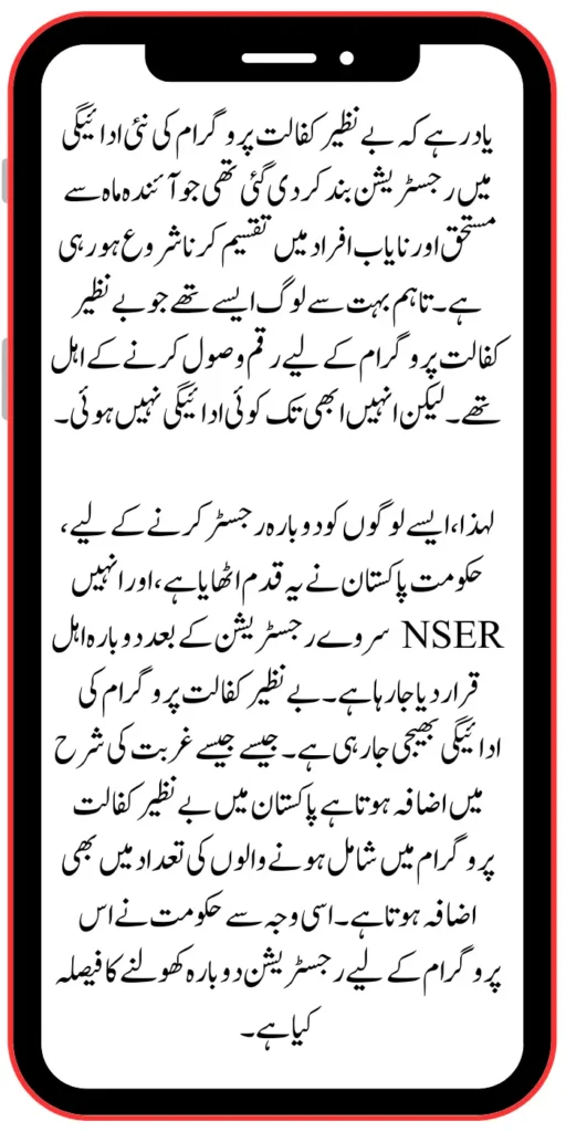 So, to re-register such people, the government of Pakistan has taken this step, and they are being declared eligible again after NSER survey registration. The Benazir kafaalat program payment is being sent. As the rate of poverty increases, the number of people joining the Benazir Kafalat program in Pakistan also increases. For this reason, the government has decided to reopen registration for this program.