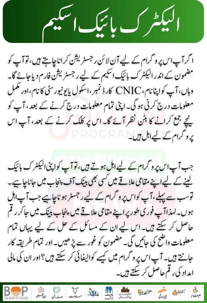 When you qualify for this program, you must go to any Bank of Punjab in your local area to get your electric bike. So first it is necessary .that you have to get your registration in this program .. when you will be eligible. So you can immediately go to Punjab Bank in your local area and get the money. So to solve their problems, all the information will be clarified here. Read the article carefully. And know all the procedures. How can you qualify in this program? And can get their financial aid money.