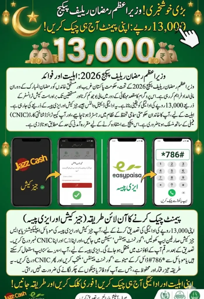 During Ramzan, the government of Pakistan provides financial assistance to help families manage their expenses. In 2026, the PM Ramzan Relief Package offers Rs 13,000 to eligible individuals. This payment is delivered digitally through JazzCash and Easypaisa, allowing beneficiaries to receive funds quickly and safely. Understanding how to check and verify this payment is crucial for a smooth experience.