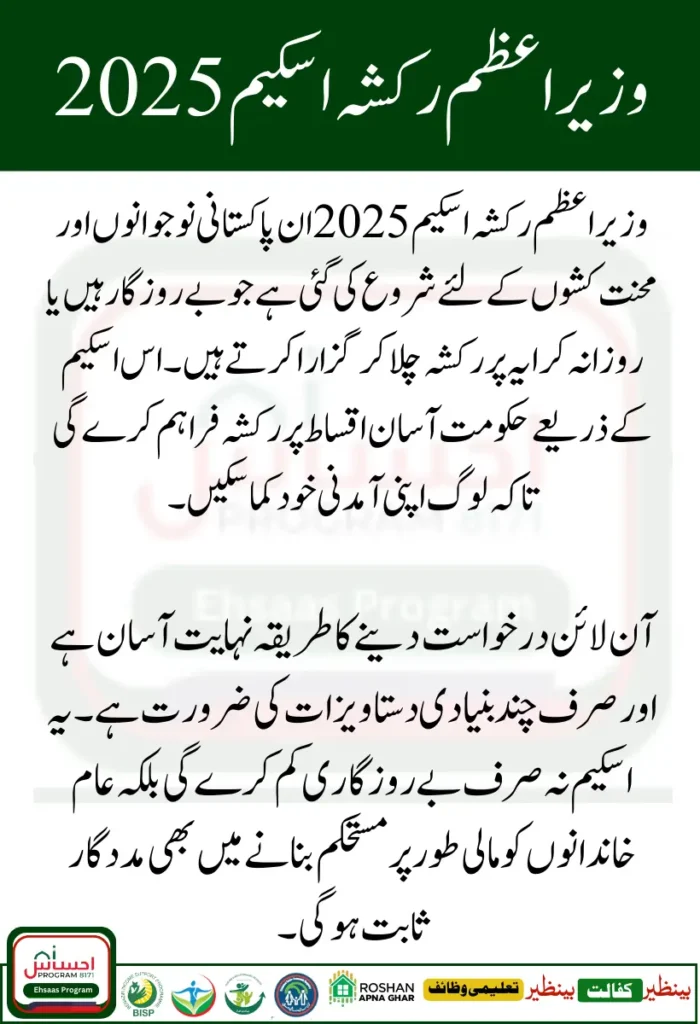 The Government of Pakistan has recently introduced the PM Rickshaw Scheme 2025 to support poor and middle-class families, especially those who depend on daily wages. In todayβs Pakistan, unemployment is a big problem, and many people are struggling to provide for their families.