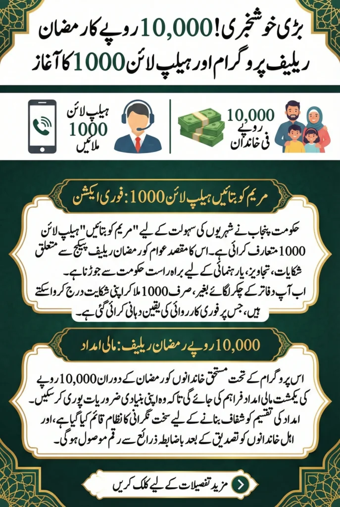 The Punjab government has introduced a new public support initiative to help families manage expenses during Ramadan. Under this announcement, a special helpline named “Maryam Ko Batayein 1000” has been launched along with a Rs. 10,000 Ramadan Relief Program for deserving households. The aim is simple: provide financial assistance and give citizens a direct way to share complaints or concerns without facing unnecessary hurdles.