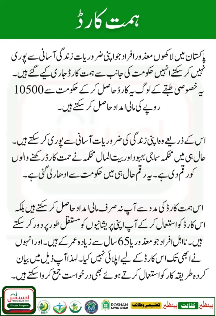 In Pakistan, millions of people with disabilities who cannot easily meet their living needs have been issued Himat Cards by the government. These special class people can get financial assistance of 10500 rupees from the government by getting this Himmat card.
