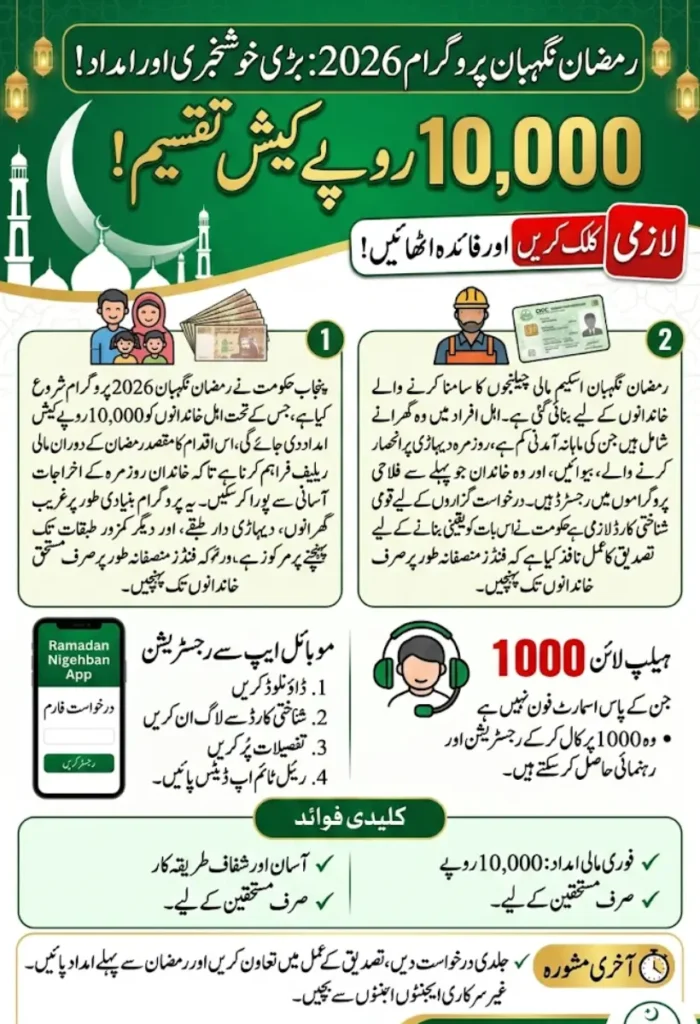 Punjab government has started the Ramadan Nigehban 2026 program, offering Rs 10,000 in cash assistance to eligible families. This initiative aims to provide financial relief during Ramadan, helping families manage their daily expenses and celebrate the holy month with ease. The program focuses on reaching low-income households, daily wage earners, and other vulnerable groups across the province.