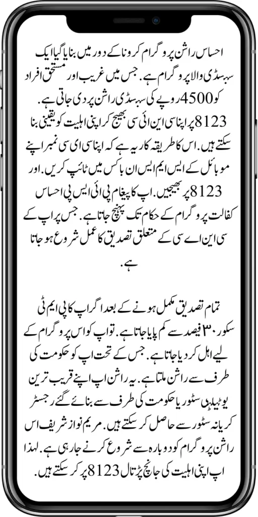 After all verification is completed if your PMT score is found less than 30%. So you are qualified for this program. Under which you get ration from the government. You can get this ration from your nearest utility store or registered grocery store made by the government. Maryam Nawaz Sharif is going to restart this ration program. So you can check your eligibility on 8123 8123 Ehsaas Rashan Program.