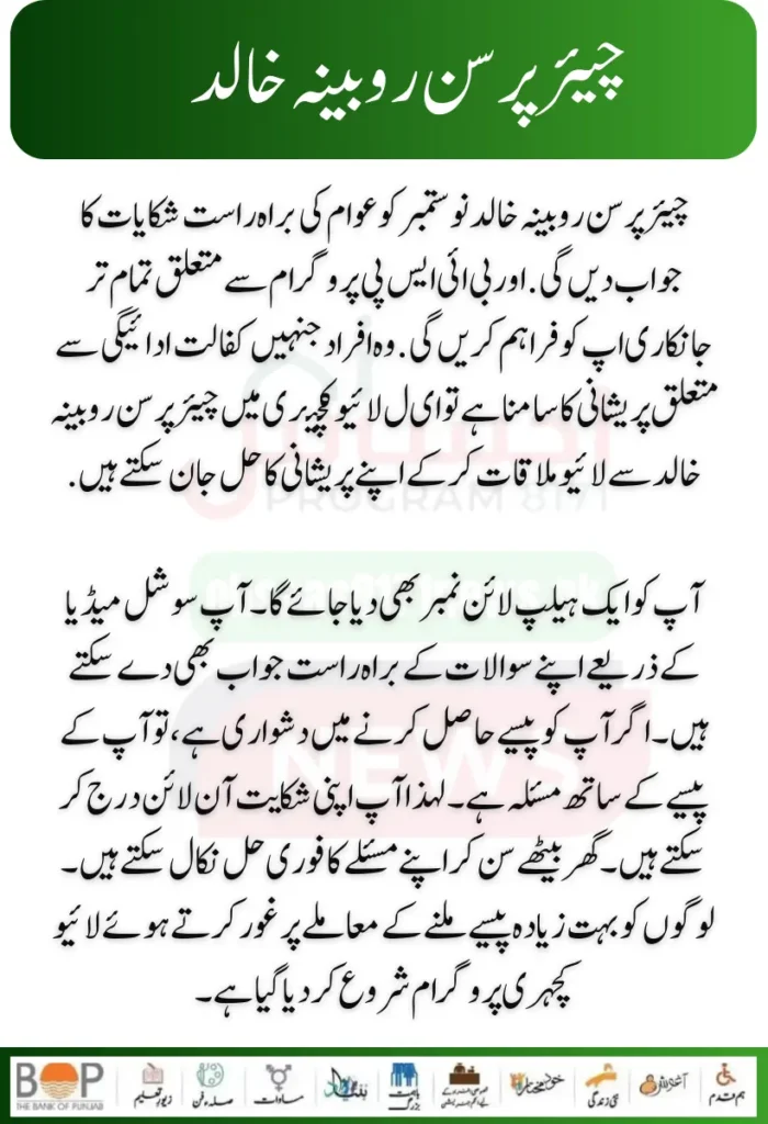 Chairperson Rubina Ghalib Zero will respond to public complaints directly on September 9 and provide you with all the information related to the BISP program. Those facing problems associated with the payment of kafaalat can find a solution by meeting the chairperson, Rubina Khalis, who lives at E-Live Kacheri.