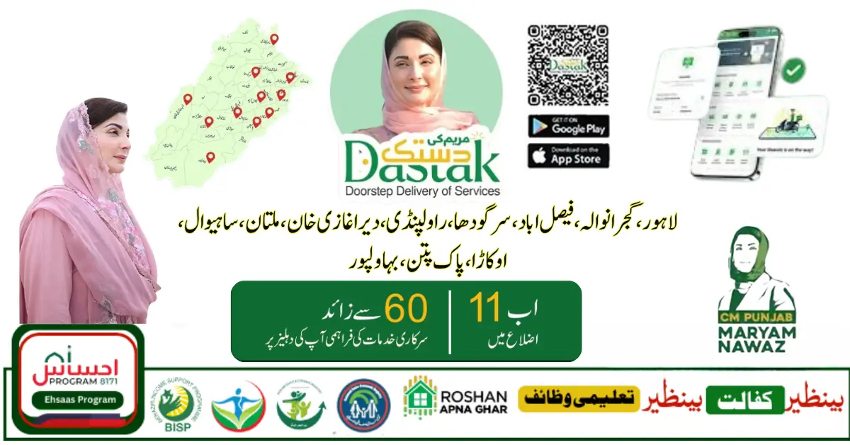 All the people of up to 11 districts can do the basic work at their doorstep sitting at home. If you want to make your vehicle license sitting at home. Or want to make a childless form. Want to make an ID card? Maryam Ki Dastak app aims to deliver more than 60 government services directly to the doorsteps of citizens in 11 districts across Punjab through trained Dastak representatives.