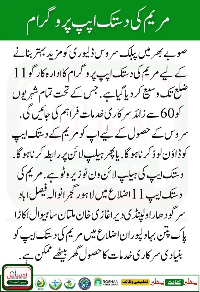 To further improve public service delivery across the province, Maryam ki Dastak program has been expanded to 11 districts. Under this, more than 60 government services will be provided to all citizens. To avail of the service, you have to download the Maryam ki Dastak App.