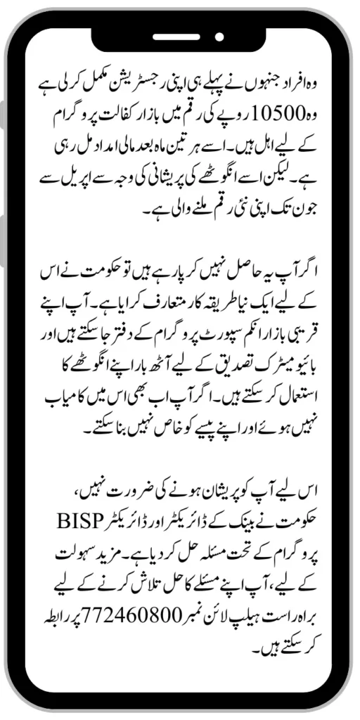 If you are not able to achieve this, the government has introduced a new procedure for this. You can go to your nearest Benazir Income Support Program office and use your thumb eight times for biometric verification. If you are still not successful in this and can’t make your money special.