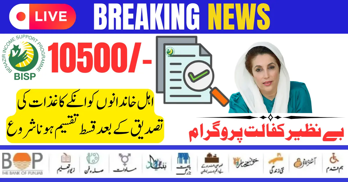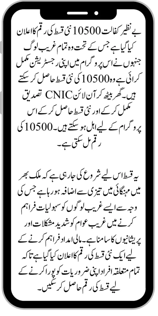 Benazir Kafaalat 10500 new instalment amount has been announced under which all the poor people who have completed their registration in this program can get the new instalment amount of 10500. eligible for this but they could not complete their registration due to any reasons, so now they can sit at home and get eligible for this program by completing online CNIC verification and getting the new instalment. 10500 can get the amount.